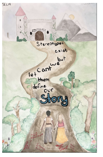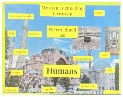 Student Backstory: I am Muslim, and after 9/11 especially Muslims have been given somewhat of a bad rap. People fear Muslims, calling us terrorists, and I wanted to combat that stereotype. I worked with my friend, who wanted the same thing, to create a poster that tells us to look past the stereotypes and see Muslims for who we are, not what political figures want you to see. That is why we created a poster that tells us to not use society’s definition of Muslims, but to define us as humans, too.