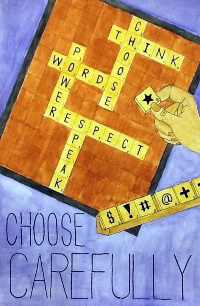Student Backstory: “…I used a Scrabble board to show the impact words can have on others, and that we have a choice to speak with encouragement instead of hate. The perspective is from the person deciding on what word to use. The scrabble letters…are symbols to represent hurtful curse words that could be made and the symbol tiles have a higher point value (in bottom corner of each tile) to represent the power of language.”